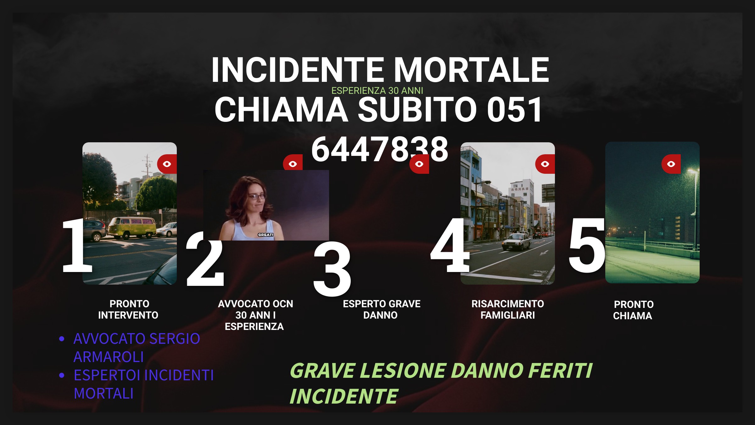 CHIAMA SE UN TUO PARENTE HA AVUTO UN GRAVE INCIDENTE O UN INCIDENTE MORTALE CHIAMA SUBITO PER UN PRONTO INTERVENTO DI UN AVVOCATO ESPERTO DI INCIDENTI GRAVI O MORTALI,